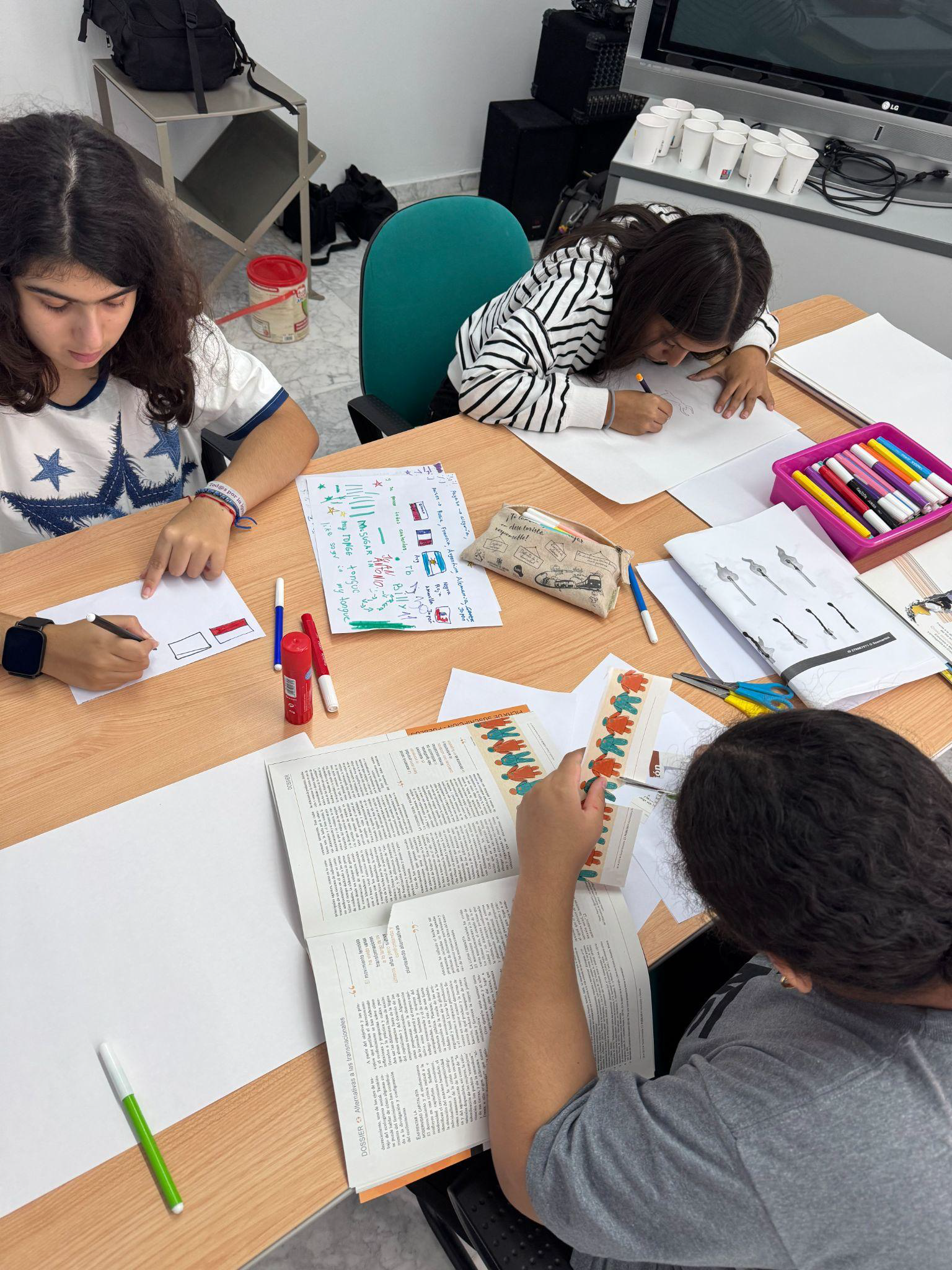El día 4 se ha continuado creando en el albergue juvenil, por lo que nos hemos desplazado hasta allí. En primer lugar, hemos ordenado una secuencia de imágenes para ver cómo quedaría una vez que pasamos a esta técnica, es decir, ver la diferencia entre verlo en papel y verlo a través de la pantalla. Posteriormente, por grupos hemos inventado nuestra propia historia positiva, con sus personajes, escenarios, y todo lo necesario, ya que luego hemos tenido que crearlos nosotros mismos. Los diferentes escenarios y personajes los hemos podido crear con los materiales que hemos preferido: plastilina, hojas de revista, folios, rotuladores, etc.